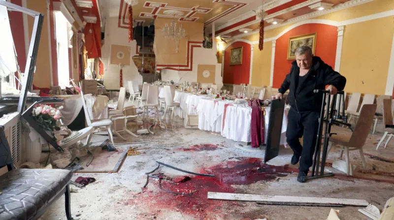 رجل يتفقد آثار الدماء والدمار التي خلفها قصف على مطعم في دونيتسك أمس (أ.ب)