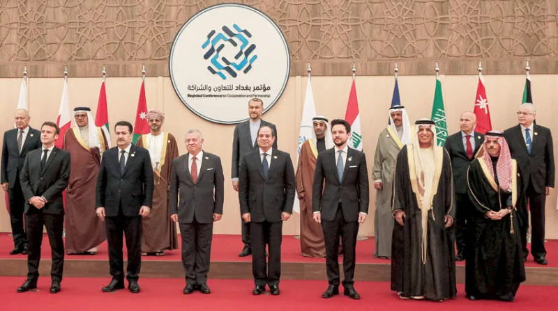 الرئيس ماكرون لدى حضوره قمة «بغداد 2» في الأردن (أ.ف.ب)