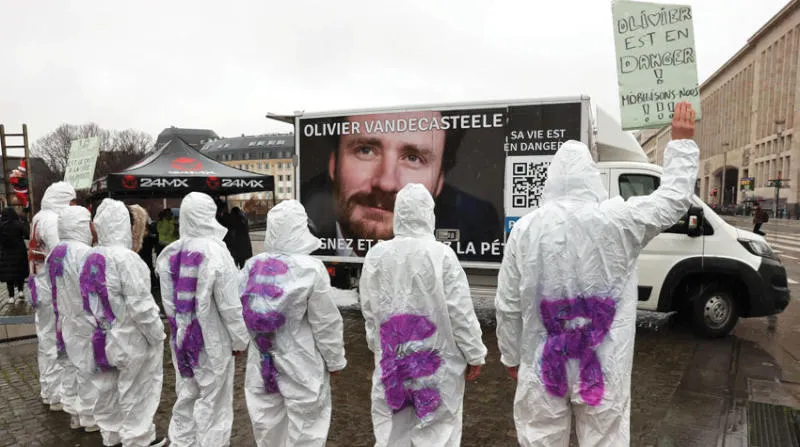 متظاهرون يرتدون ملابس كتب عليها شعارات تطالب بإطلاق سراح أوليفييه في بروكسل