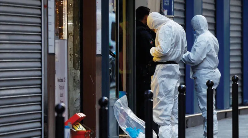 الشرطة الجنائية تفحص مكان الجريمة في باريس الجمعة (رويترز)