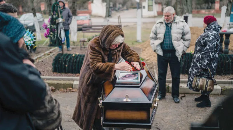 أوكرانية تبكي ابنتها في تشييع شمال خيرسون أمس (أ.ف.ب)