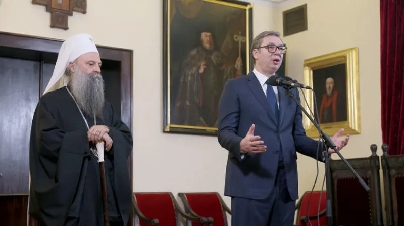الرئيس الصربي وبطريرك الكنيسة الأرثوذكسية يتحدثان للصحافيين بعد لقائهما أول من أمس (إ.ب.أ)