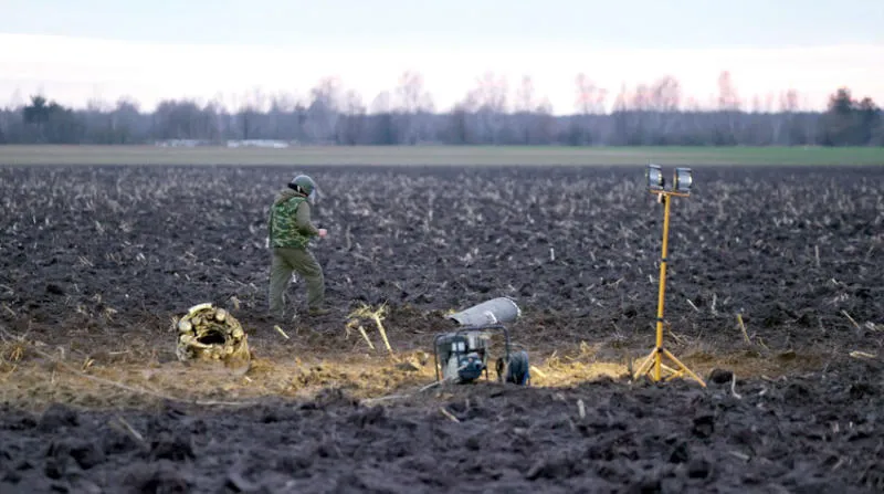 محقق عسكري يتفقد شظايا صاروخ في بيلاروس في 29 ديسمبر (إ.ب.أ)