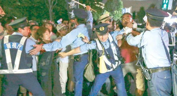ورفع عشرات السياسيين شعارات احتجاج ضد ما اعتبروه تمريرا «قسريا» لقوانين ستغير الدور العسكري لليابان بطريقة تتعارض مع الدستور السلمي للبلاد. وقد دخل هؤلاء البرلمانيون الغرفة بعد دقائق من دعوة رئيس اللجنة ياسوكازو هامادا، عضو الحزب الليبرالي الديمقراطي الذي يقوده أبي، إلى التصويت. وردد هؤلاء البرلمانيون شعارات غاضبة، ورفعوا لافتات كتب عليها «لا لسياسات آبي» و«لا لقرار قسري»، بينما سارع زملاؤهم المحافظون إلى التصويت على النص الذي مر بسهولة.
