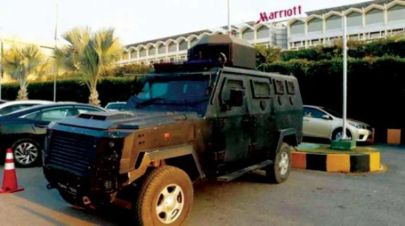 سيارة شرطة باكستانية خارج فندق ماريوت بالعاصمة إسلام آباد بعد إنذار أمني بتهديد إرهابي (إ.ب.أ)