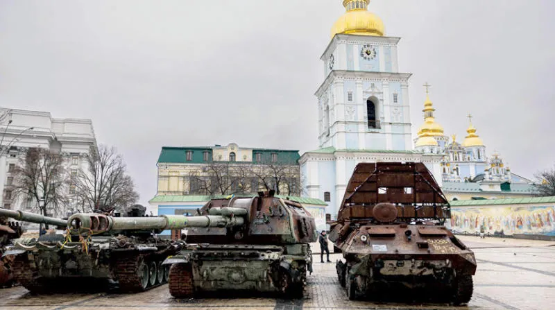 دبابات روسية مدمَّرة تُعرض أمام إحدى كنائس كييف (أ.ف.ب)