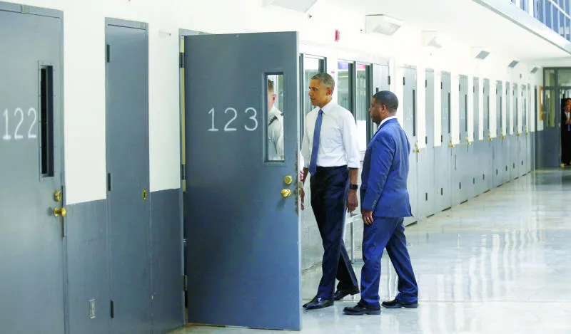 أصبح الرئيس باراك أوباما أمس أول رئيس أميركي يزور خلال ولايته سجنا أميركيا، وذلك بعد وصوله إلى السجن الفيدرالي في الرينو في ولاية أوكلاهوما جنوب البلاد. وكان الهدف من هذه الزيارة هو تسليط الضوء على الثغرات في واحد من أنظمة السجون الأكثر كلفة واكتظاظا في العالم، ويتقدم على مثيليه في الصين وروسيا.