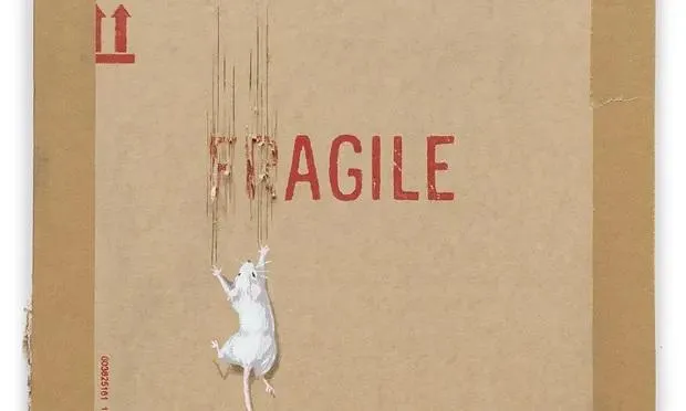 الأعمال الفنية تُظهر شكل فأر أبيض يزرع مخالبه في علبة عليها عبارة «مواد هشة» (إنستغرام)