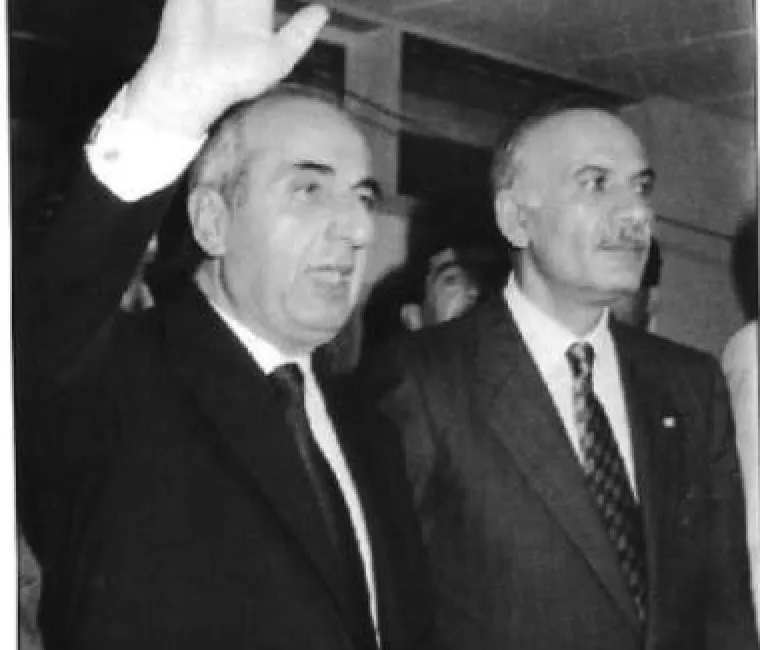 رينيه معوض يقسم اليمين بعد انتخابه أول رئيس بعد إقرار اتفاق الطائف وإلى جانبه رئيس مجلس النواب آنذاك حسين الحسيني