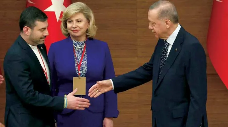 الرئيس التركي مع المفوضة السامية لحقوق الإنسان في روسيا تاتيانا موسكالكوفا ومحقق الشكاوى الأوكرانية دميترو لوبينيتس في أنقرة الأربعاء على هامش مؤتمر دولي تنظمه مؤسسة أمناء المظالم في تركيا حول «مستقبل حقوق الإنسان في القرن الـ21» (أ.ف.ب)
