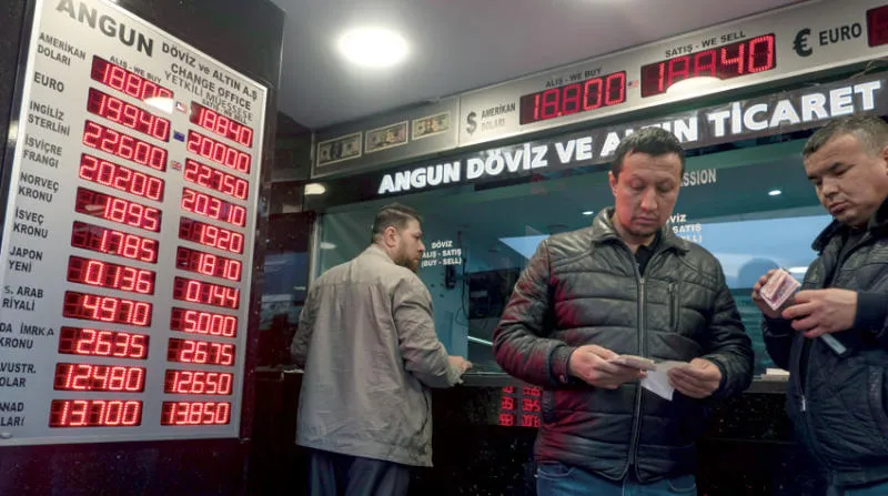 متعاملون يغيرون أموالهم في مكتب صرافة بإسطنبول (إ.ب.أ)