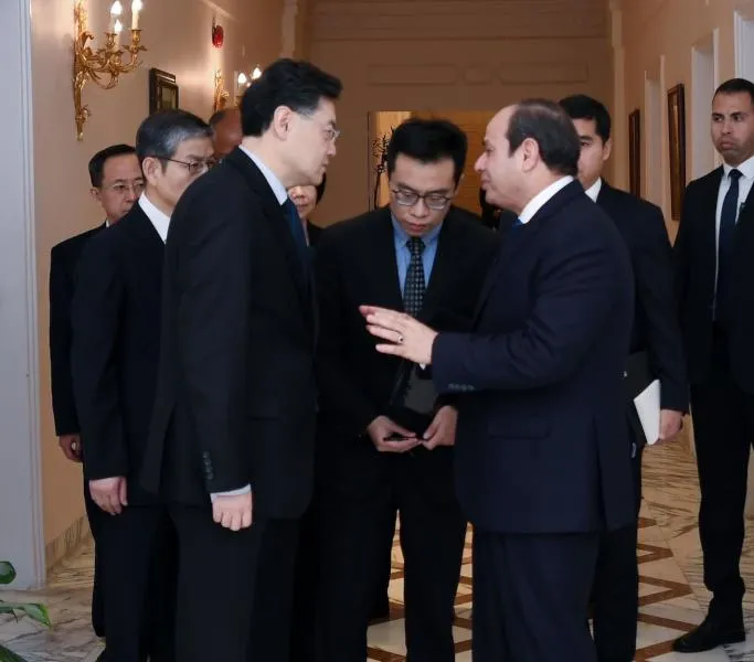 والتقى الرئيس المصري عبد الفتاح السيسي، في القاهرة، الأحد، وزير الخارجية الصيني تشين جانغ، الذي يقوم بجولة أفريقية تشمل 5 دول. ووفق المتحدث الرسمي باسم الرئاسة المصرية، فإن السيسي أكد حرص مصر على «الاستمرار في التعاون المثمر في إطار الشراكة الاستراتيجية الشاملة التي تجمع البلدين، في ظل المسار الممتد من التعاون والتنسيق النموذجي بين الجانبين في شتى المجالات، فضلاً عن الأداء المتميز للشركات الصينية المشاركة في العملية التنموية في مصر».