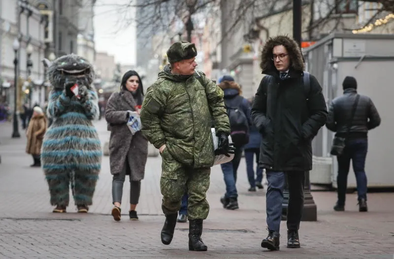 جندي روسي يسير في شارع بوسط موسكو اليوم (إ.ب.أ)