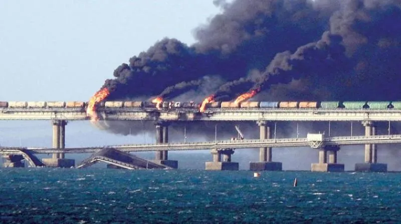 ألسنة النار وسحب الدخان تتصاعد من موقع انفجار وقع في أكتوبر الماضي على جسر القرم (أ.ف.ب)
