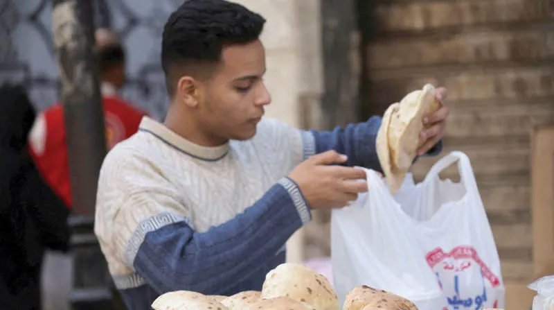 رجل في إحدى أسواق القاهرة يوم الثلاثاء يشتري أرغفة الخبر (رويترز)