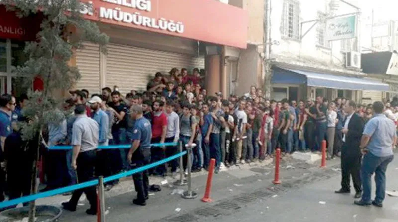 سوريون أمام إحدى إدارات الهجرة التركية لمراجعة طلبات الإقامة والجنسية (موقع إيجه دا سونسوز)