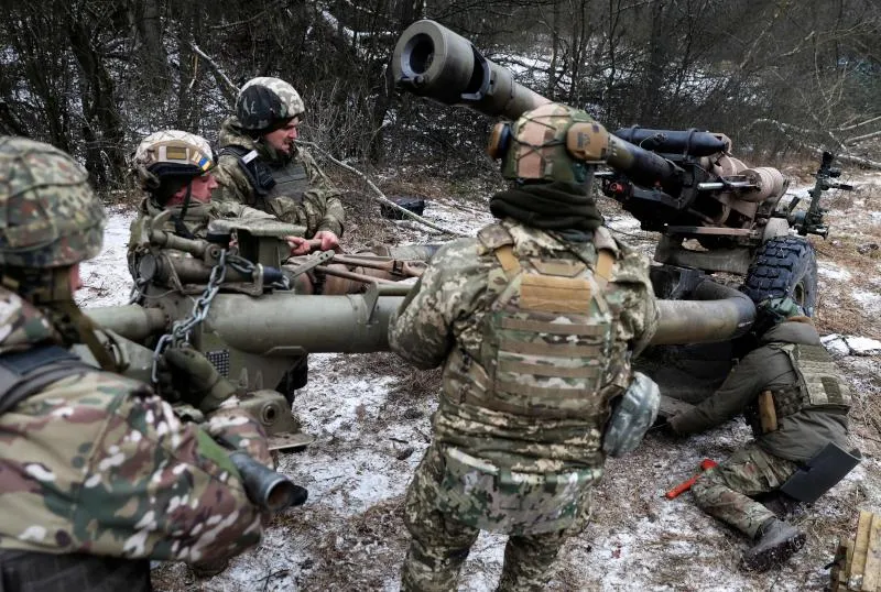 جنود أوكرانيون يجهزون مدفع هاوتزر في دونيتسك تمهيدا لقصف مواقع روسية (أ.ف.ب)