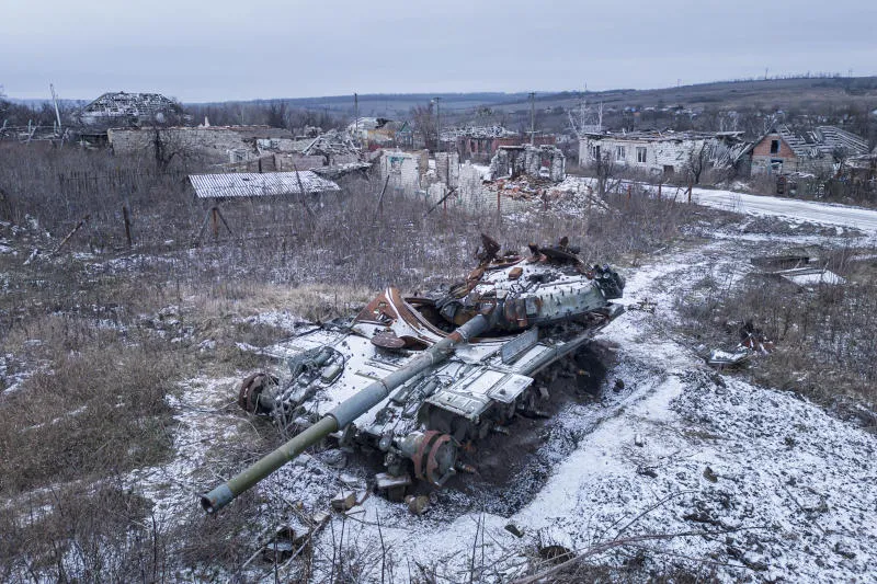 دبابة روسية مدمرة مغطاة بالثلوج تقف في قرية كاميانكا بمنطقة خاركيف الأوكرانية (أ.ب)