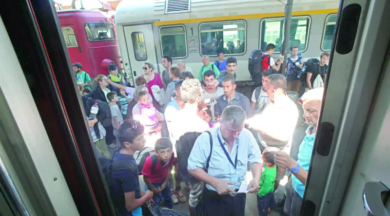 مهاجرون غير شرعيين من سوريا وباكستان وأفغانستان متجمعون في محطة قطار ببلغراد للتوجه إلى المجر (إ.ب.أ)