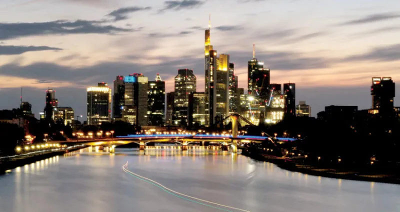 غروب الشمس في مدينة فرانكفورت التي تعد بمثابة العاصمة المالية في ألمانيا (رويترز)