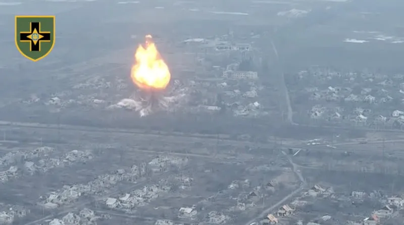 صورة وزعها الجيش الاوكراني لما قال إنه قصف لمركز للجيش الروسي في بلدة كورديوميفكا بمنطقة دونيتسك الأوكرانية (رويترز)