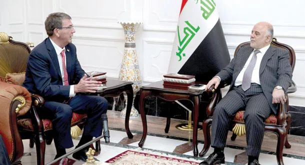 رئيس الحكومة العراقية حيدر العبادي خلال استقباله وزير الدفاع الأميركي آشتون كارتر في مكتبه برئاسة الوزراء في بغداد أمس (رويترز)