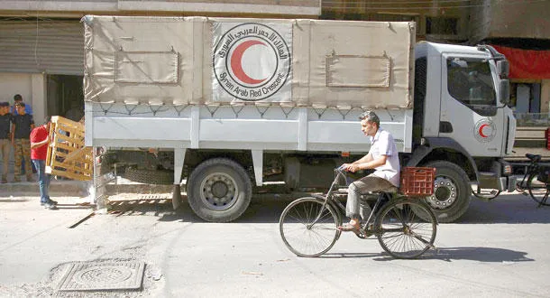 رجل من دوما بريف دمشق يمر بدراجته بجانب شاحنة تابعة للهلال الأحمر السوري التي توزع الأدوية واللقاحات في المدينة المحاصرة من قبل النظام. (أ.ف.ب)