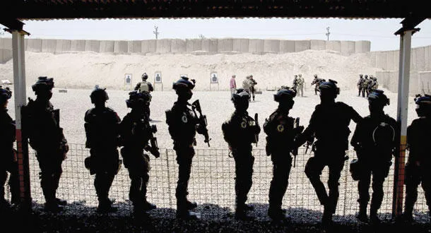 مقاتلون من الجيش العراقي يتدربون على الرمي في مركز مكافحة الإرهاب ببغداد أمس (رويترز)