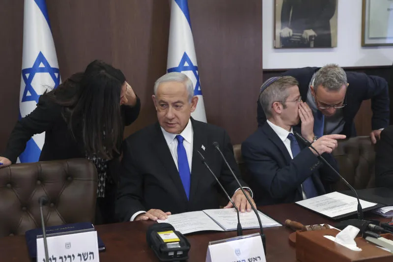 نتنياهو يتحدث مع وزيرة النقل ميري ريغيف خلال الاجتماع الأسبوعي للحكومة اليوم (أ.ب)