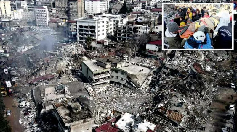 أبنية دمرها الزلزال في كهرمان ماراش بتركيا (إ.ب.أ) وفي الاطار مسعفون ينقذون أحد الناجين من تحت الأنقاض في البلدة ذاتها (أ.ف.ب)