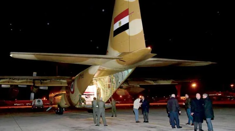 طائرة عسكرية مصرية تنقل مساعدات لضحايا الزلزال بعد هبوطها في مطار دمشق مساء أول من أمس (سانا/د.ب.أ)