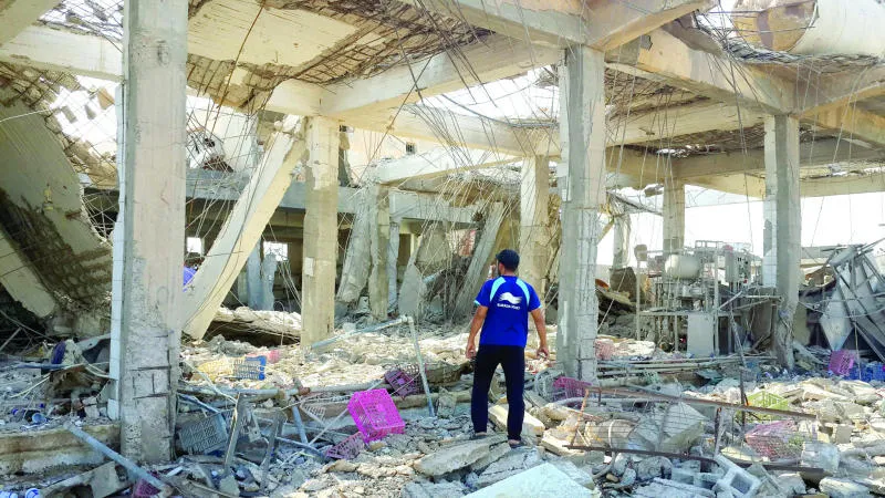 عراقي يقف وسط أنقاض بناية دمرها قصف جوي في الفلوجة أمس (إ.ب.أ)