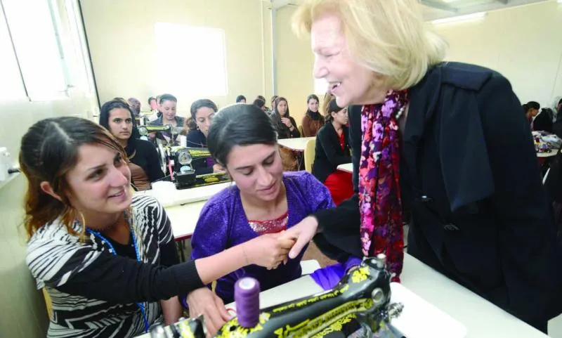 البارونة إيما نيكلسون تتحدث إلى نازحات إيزيديات في مخيم خانكى قرب دهوك بإقليم كردستان («الشرق الأوسط»)