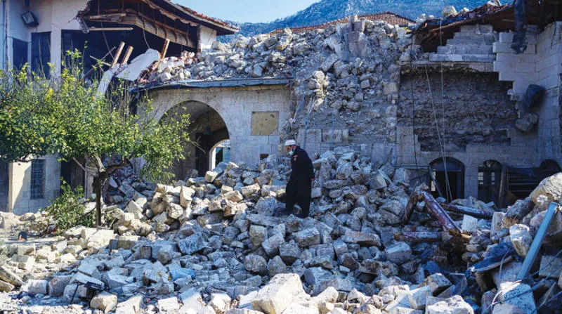 تركي يعاين ركام مسجد دمره الزلزال في مدينة أنطاكيا التاريخية جنوب تركيا أمس (أ.ف.ب)