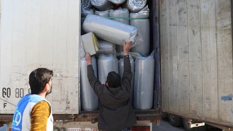 مسؤولون يفحصون الشاحنات التي تحمل مواد إغاثية مرسلة من قبل وكالات الأمم المتحدة لمساعدة الضحايا المتضررين من الزلزال بعد عبور معبر باب الهوى الحدودي بمحافظة إدلب (إ.ب.أ)