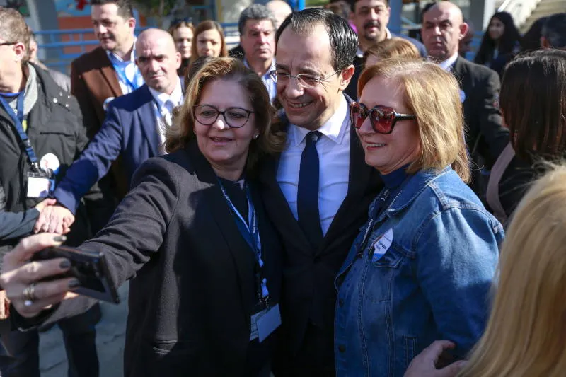 خريستودوليدس يلتقط صوراً مع أنصاره بعد الإدلاء بصوته أمس (إ.ب.أ)