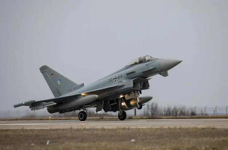 طائرة «يوروفايتر» المقاتلة الألمانية تحط في مطار برومانيا في 17 فبراير 2022 (رويترز)