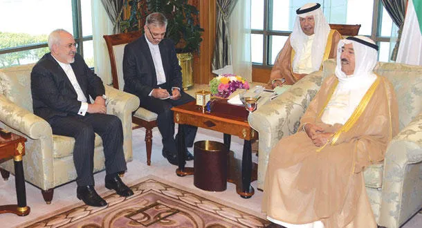 أمير دولة الكويت الشيخ صباح الأحمد الجابر الصباح خلال استقباله محمد جواد ظريف وزير خارجية إيران يوم أمس (أ.ف.ب)