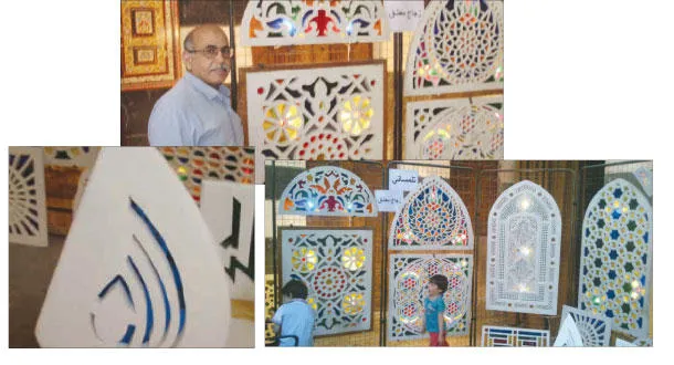 تلمساني مع منتجاته من الزجاج المعشق، زجاج معشق نوافذ بألوان زاهية ومنظر جميل، لفظ الجلالة على زجاج معشق.