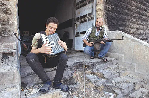 مقاتل في «الجيش الحر» يعزف على آلة الأكورديون في حي سيف الدلة بحلب (رويترز)