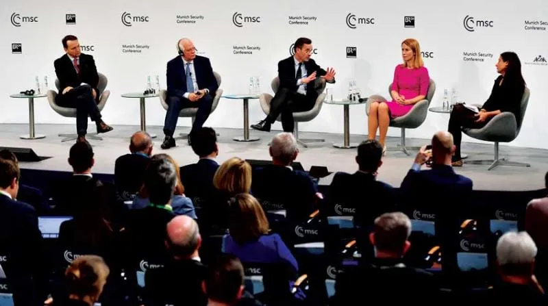 بوريل وكالاس خلال مشاركتهما في جلسة خلال اليوم الأخير من «مؤتمر ميونيخ للأمن» أمس (إ.ب.أ)
