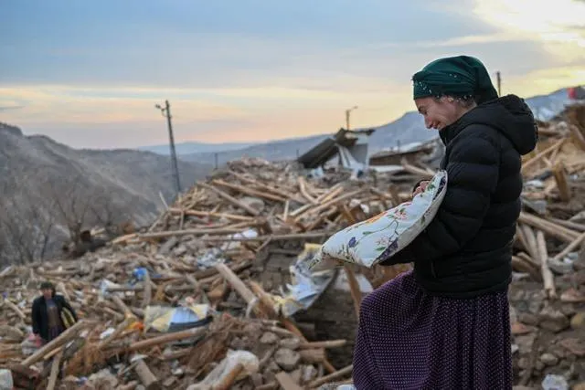 سيدة تبكي بحرقة خلال محاولة إنقاذ ما يمكن من بيتها المدمر في منطقة أديامان (أ.ف.ب)