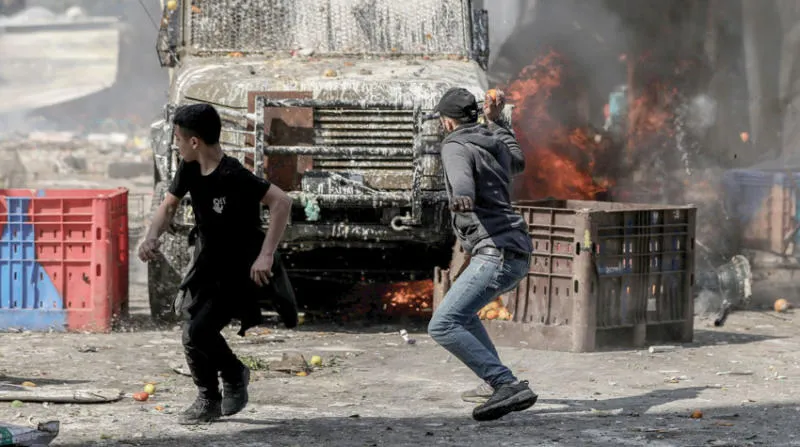 شابان فلسطينيان أمام مركبة للجيش الإسرائيلي خلال مواجهات في نابلس الأربعاء (د.ب.أ)