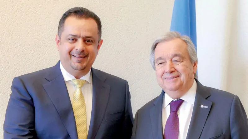 وأكد رئيس الحكومة معين عبد الملك خلال لقاء مع الأمين العام للأمم المتحدة، أنطونيو غوتيريش، على هامش مؤتمر المانحين في جنيف، دعم الحكومة و«مجلس القيادة الرئاسي» للمسار الأممي لإحلال السلام، مشدداً على ضرورة تكامل الجهود الإقليمية والدولية، واتخاذ مواقف للضغط على ميليشيات الحوثي وداعميها في طهران، من أجل الكف عن ممارساتها الإجرامية ضد الشعب اليمني.