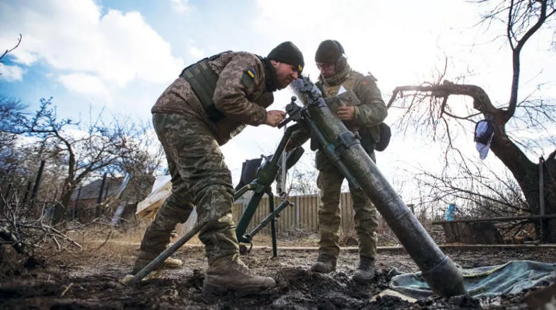 جنديان أوكرانيان يعدان لإطلاق قذيفة هاون قرب بلدة هورليفكا بإقليم دونيتسك (رويترز)