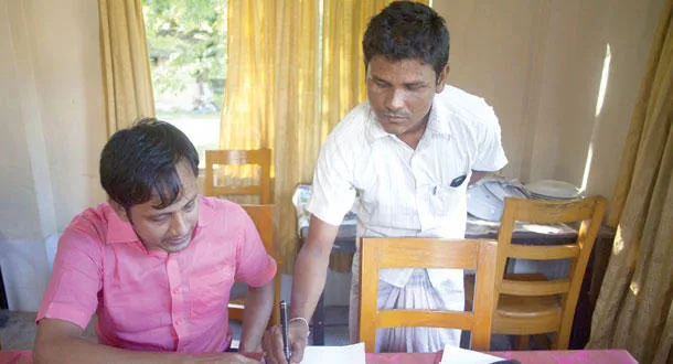 محمد موانول يوقع على دفتر لإلغاء ملفه الخاص بالهجرة إلى الهند بعد توقيع اتفاق تاريخي بين بنغلاديش والهند حول منطقة حدودية يتيح لخمسين ألف شخص يقيمون في جيوب على جانبيها اختيار الانتماء إلى أحد هذين البلدين (أ.ف.ب)