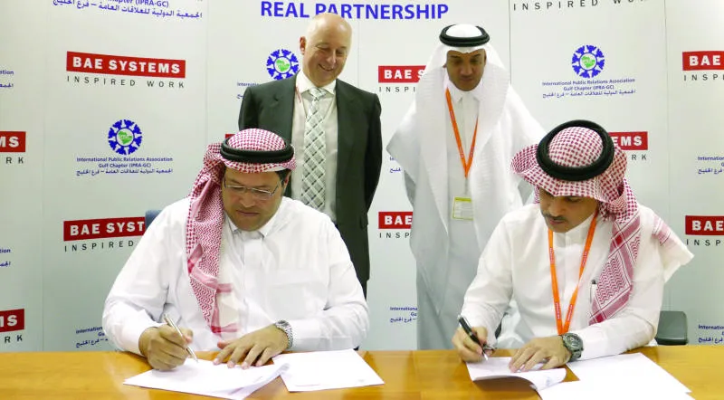 ضمن الجهود القائمة في الرفع من مستوى مهنة العلاقات العامة في السعودية، وقعت شركة «بي إيه إي سيستمز» السعودية والجمعية الدولية للعلاقات العامة فرع الخليج، مذكرة تفاهم تهدف إلى الرقي بمهنة العلاقات العامة.