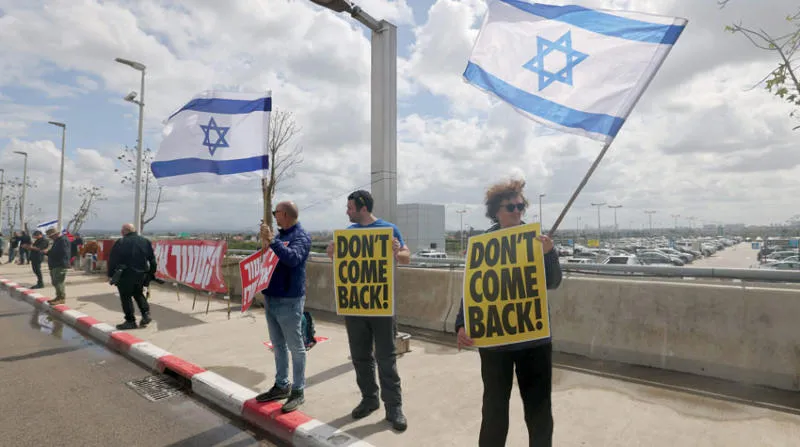 متظاهرون خارج مطار بن غوريون الأربعاء قبل ان يتوجه نتنياهو إلى ألمانيا  (إ.ف.ب)