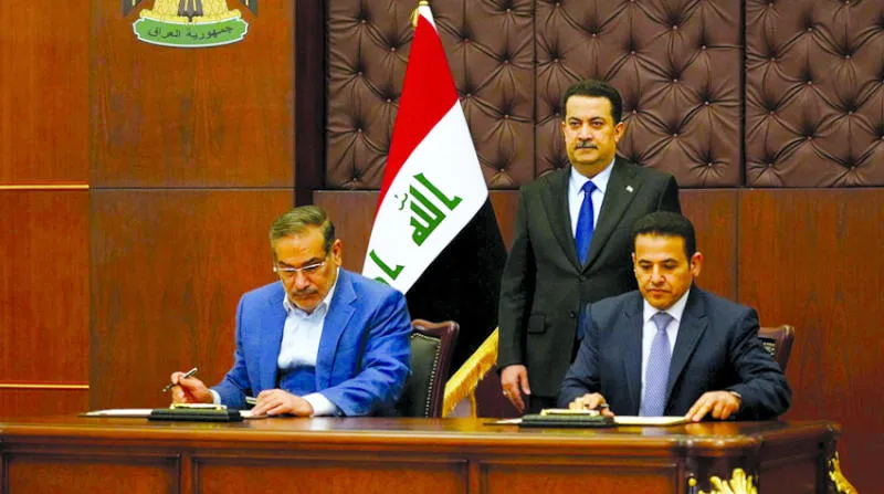 شمخاني والأعرجي يوقّعان وثائق الاتفاق بحضور السوداني في بغداد أمس (رويترز)