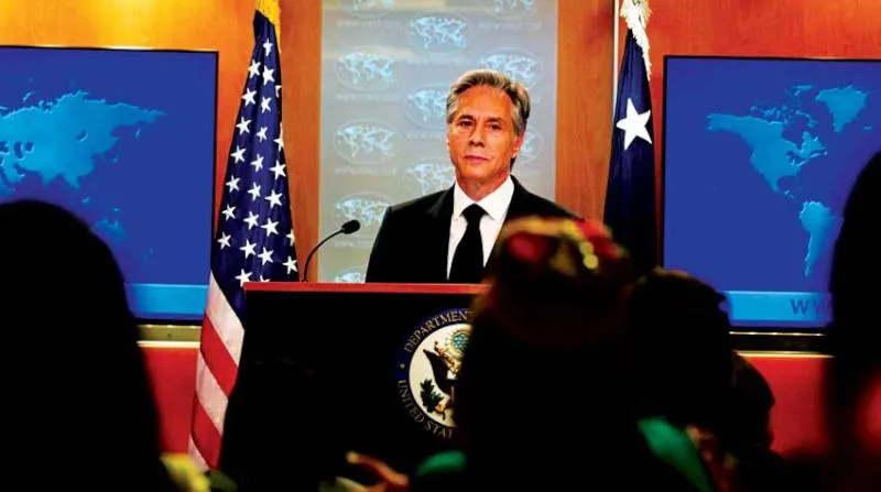 وزير الخارجية الأميركي أنتوني بلينكن خلال مؤتمر صحافي حول التقرير السنوي لحقوق الإنسان في واشنطن أمس (أ.ف.ب)
